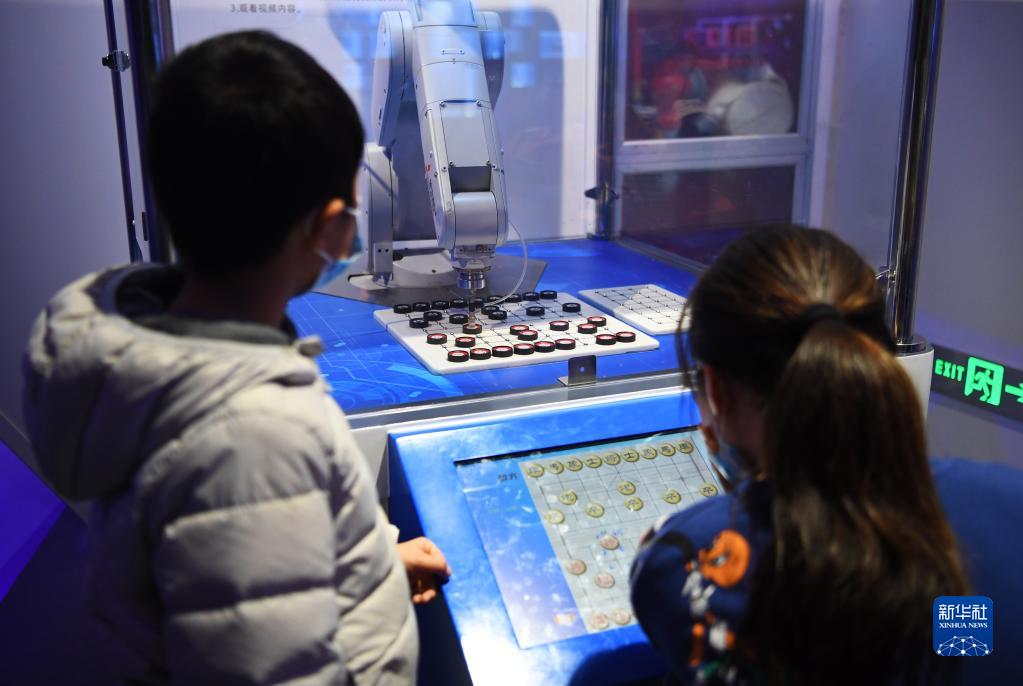 10月6日,小朋友在网络安全科技馆与智能机械臂下象棋。
