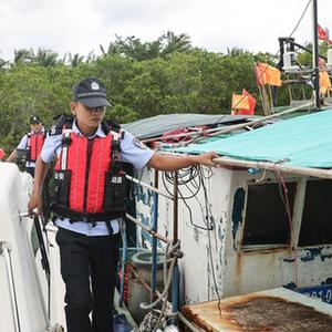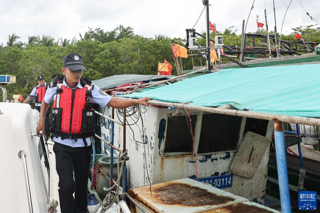 10月7日,在海南三亚铁炉港,海南省公安厅海岸警察总队第四支队后海海岸派出所的民警对渔船进行防台风检查。