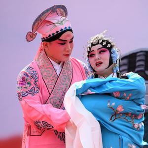 10月7日,石家庄市评剧院一团演员在石家庄市桥西区西清公园表演评剧《墙头马上》。