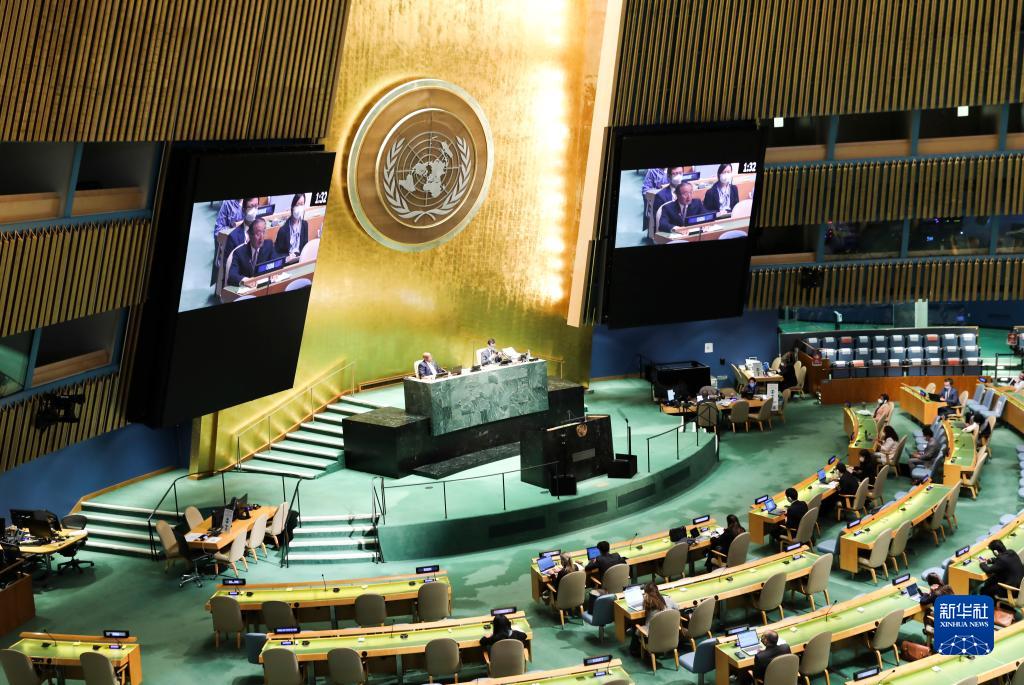 10月7日,在位于纽约的联合国总部,中国常驻联合国代表张军(屏幕上)在第76届联合国大会第三委员会一般性辩论中发言。