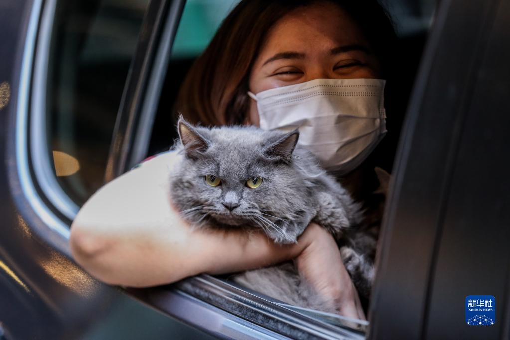 10月3日,一名女子乘车带着宠物猫参加在菲律宾奎松市举行的“不下车”宠物秀活动。