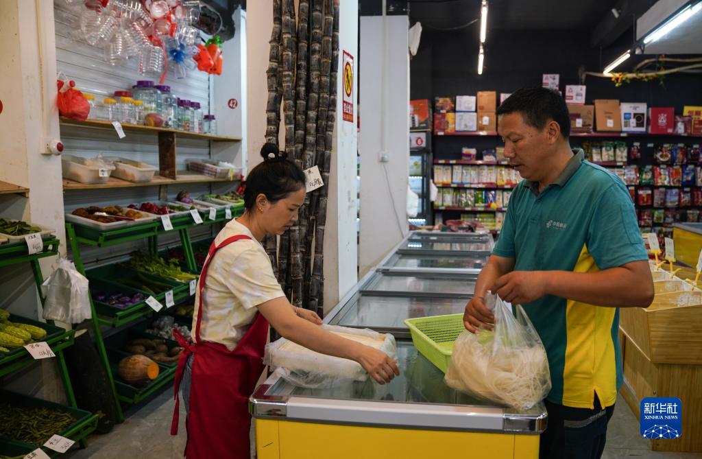 9月28日,双峰邮政所的邮递员吴文清(右)在双峰镇一家超市选购村民需要的物品。