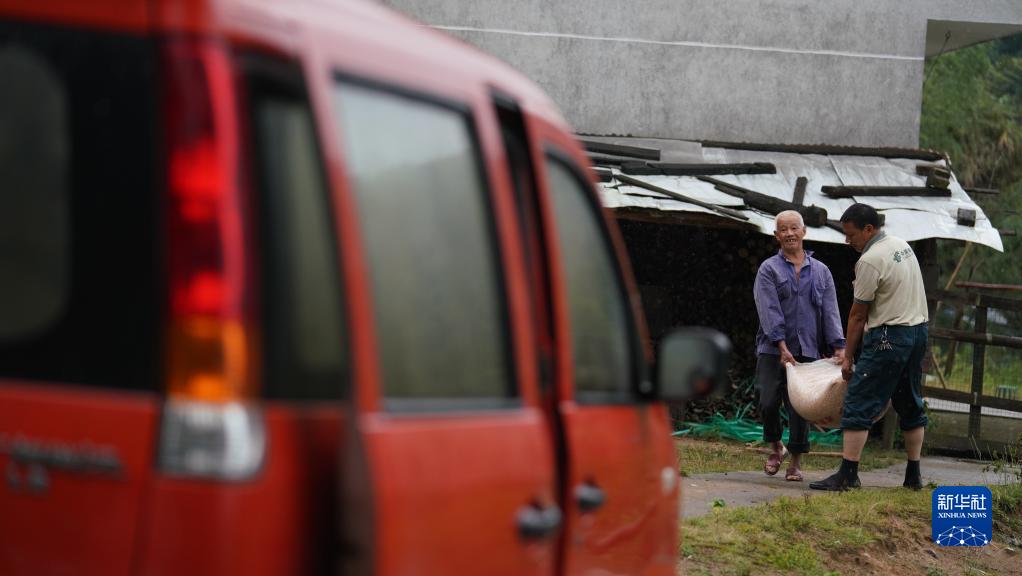 10月6日,双峰邮政所的邮递员吴文清(右)帮一位村民搬运货物。