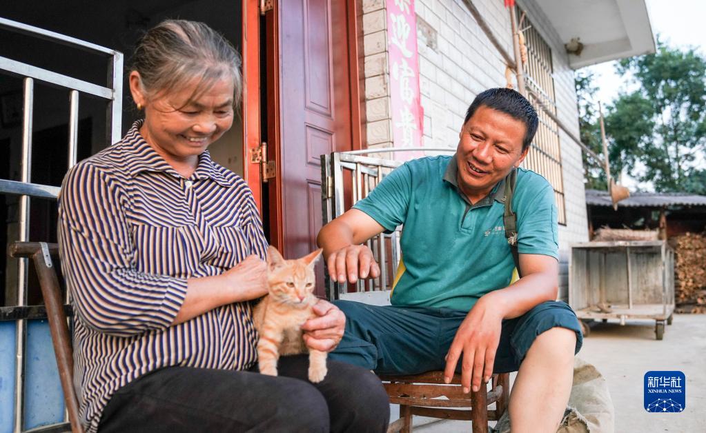 9月28日,双峰邮政所的邮递员吴文清(右)为村民派送一只猫咪。这名独居的村民此前委托吴文清为她选购一只宠物猫作伴。