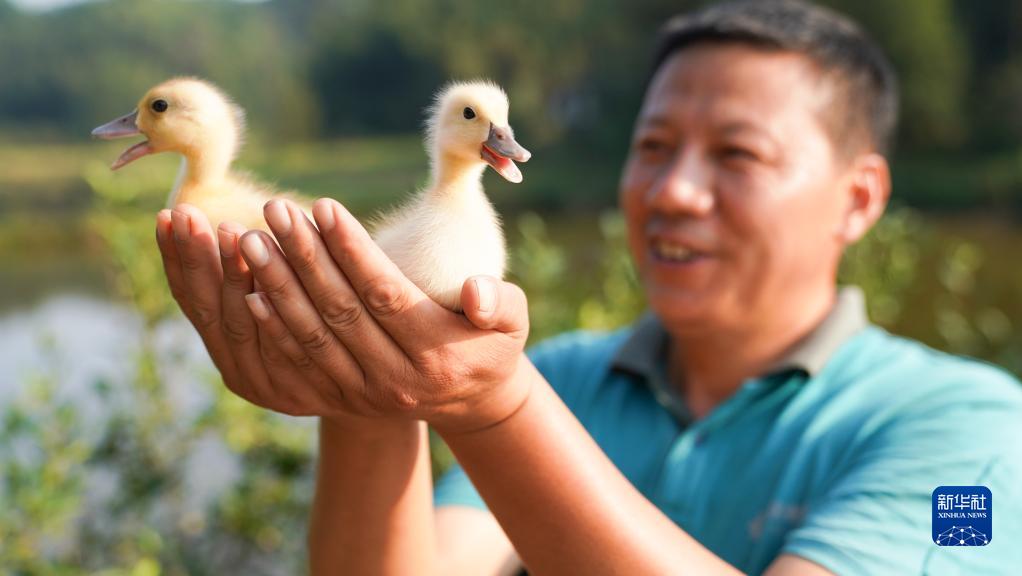 9月28日,双峰邮政所的邮递员吴文清在双峰镇的一家养殖基地帮一名村民选购鸭幼崽。