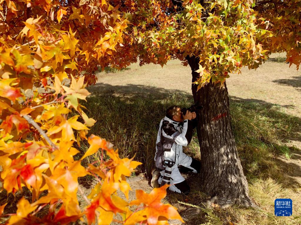 10月9日,摄影爱好者在科尔沁右翼中旗翰嘎利——五角枫旅游区内采风。