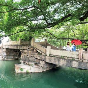 在福州市台江区,游客行走在榕树荫蔽的万寿桥上(10月7日摄)。