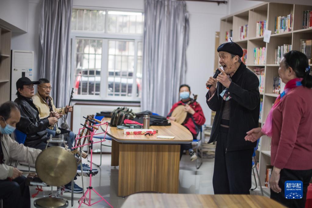居民在武汉东湖新城社区活动室唱楚剧(3月31日摄)。