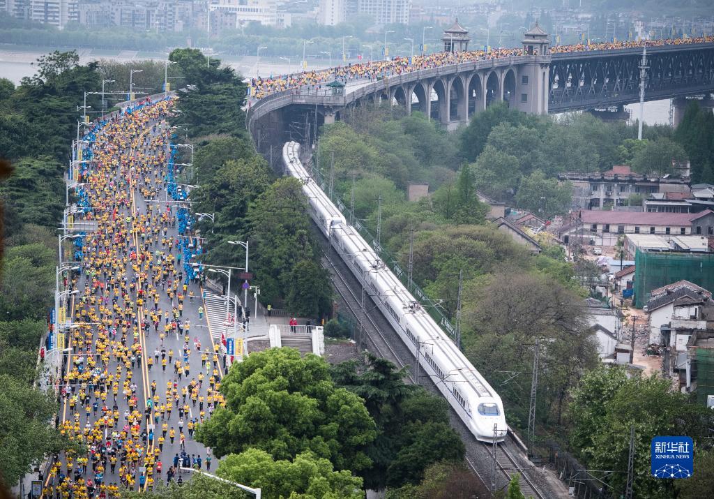 2019年4月14日,2019武汉马拉松比赛的参赛选手经过武汉长江大桥。