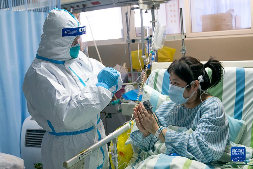 2020年1月24日,在武汉大学中南医院重症隔离病房,中南医院重症医学科主任彭志勇(左)与病情好转的患者黄淑丽互道新春快乐。