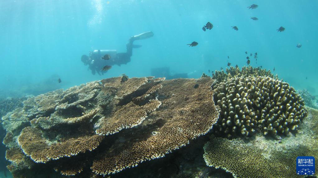 在分界洲岛海域,潜水员查看海底珊瑚生长情况(9月28日摄)。