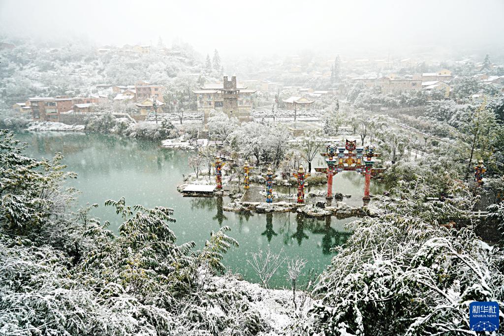 10月10日拍摄的甘肃省陇南市宕昌县官鹅沟景区鹿仁民俗村雪景。