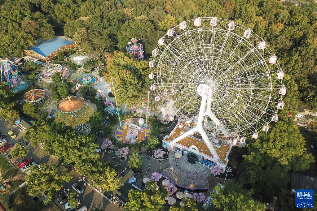 10月4日拍摄的武汉市东湖磨山景区“东湖之眼”摩天轮(无人机照片)。