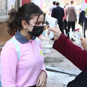 10月10日,在埃及开罗的一所中学,学生入校前接受体温测量。