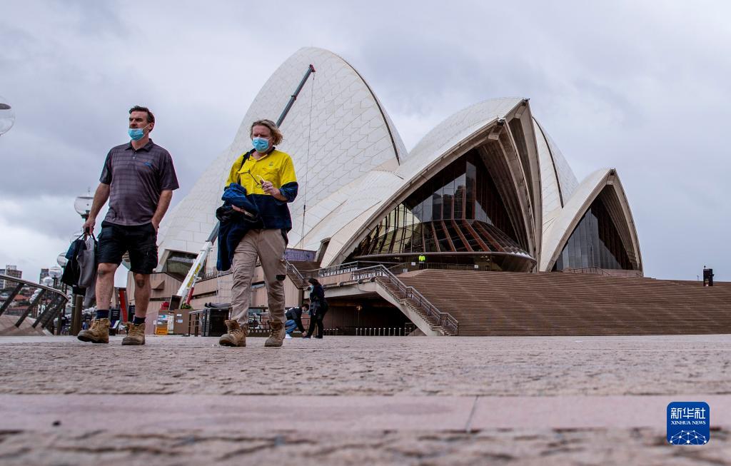 10月11日,戴口罩的行人从澳大利亚悉尼歌剧院前走过。
