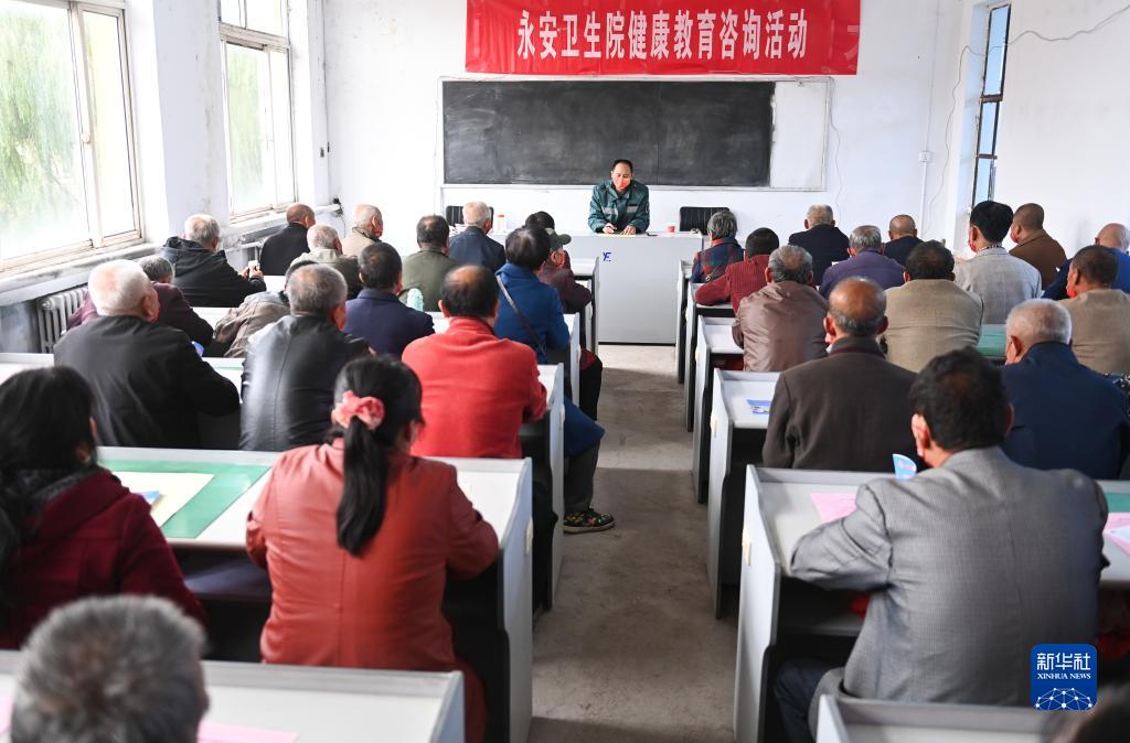 10月10日,在山西省汾西县永安镇后加楼村的安置点,永安镇卫生院工作人员为受灾群众提供健康教育咨询。