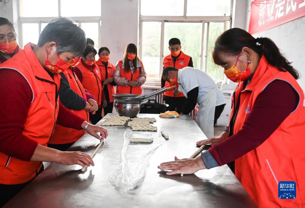 10月10日,在山西省汾西县永安镇后加楼村的安置点,受灾群众学习做麻花。