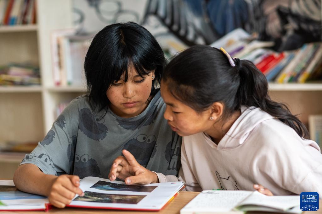 在云南省丽江市宁蒗彝族自治县易地扶贫搬迁安置区幸福家园,卢学英(左)和杨瑛在求知书屋看书(8月25日摄)。