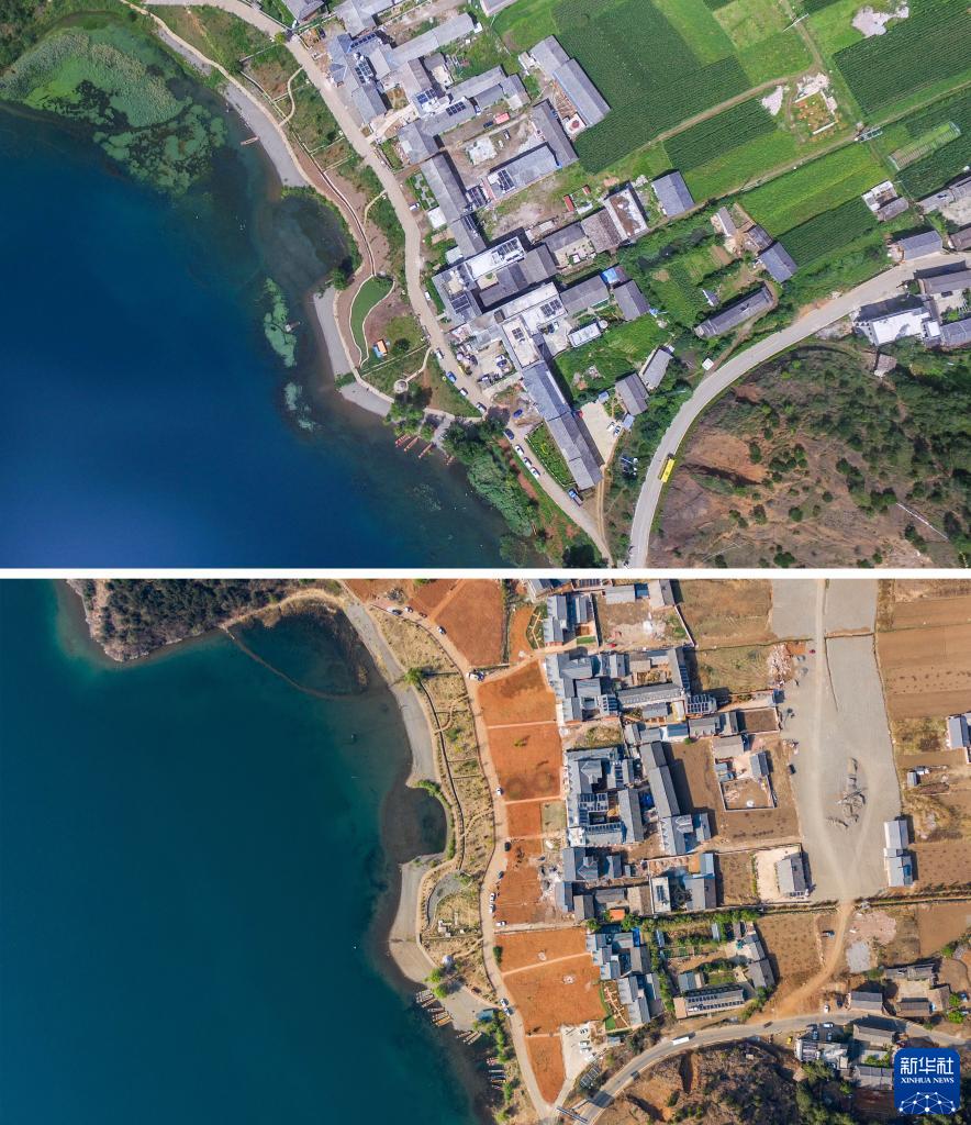 这是一张拼版照片,上图为:2016年7月26日拍摄的云南省丽江市宁蒗县永宁镇小洛水村(无人机照片,新华社发);下图为:4月17日拍摄的80米生态红线内民居客栈退出拆迁工程实施中的小洛水村,目前该项目处于生态修复阶段,将逐步进行绿化(无人机照片,新华社记者胡超摄)。