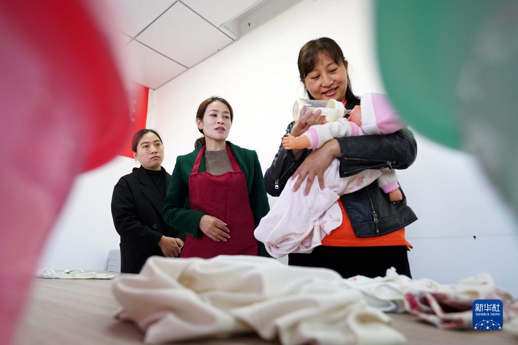 10月11日,赵娜(中)在邢台市信都区巾帼家政基地为学员讲解母婴护理知识。