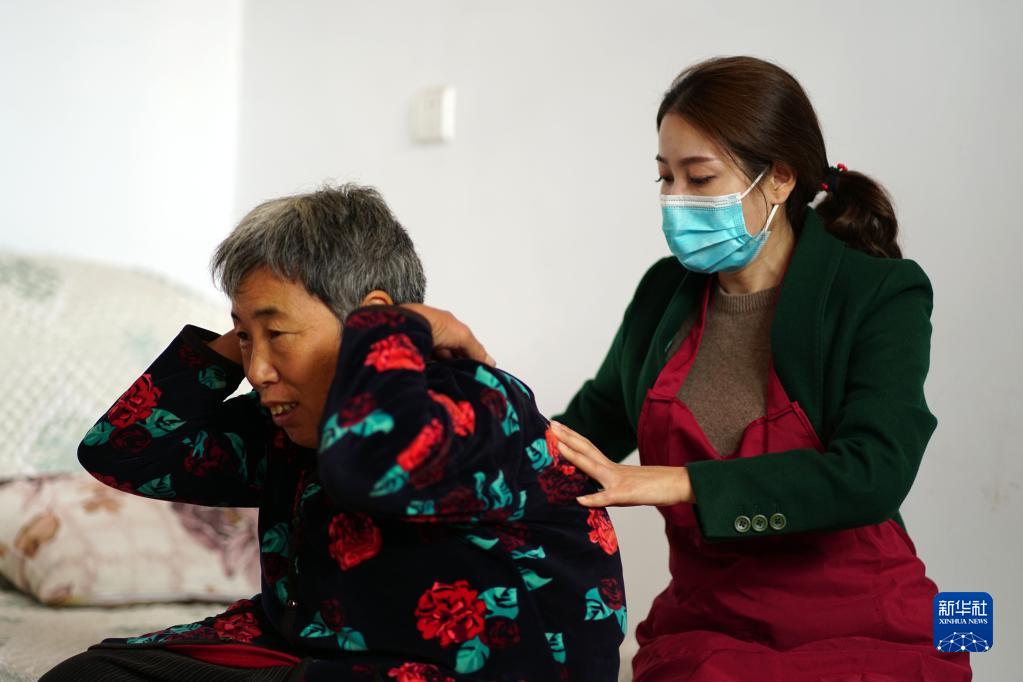 10月11日,赵娜(右)在邢台市信都区一户居民家中为老人按摩。