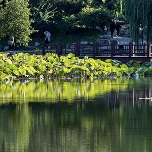 当日,北京秋高气爽,圆明园遗址公园水波潋滟,景色宜人。