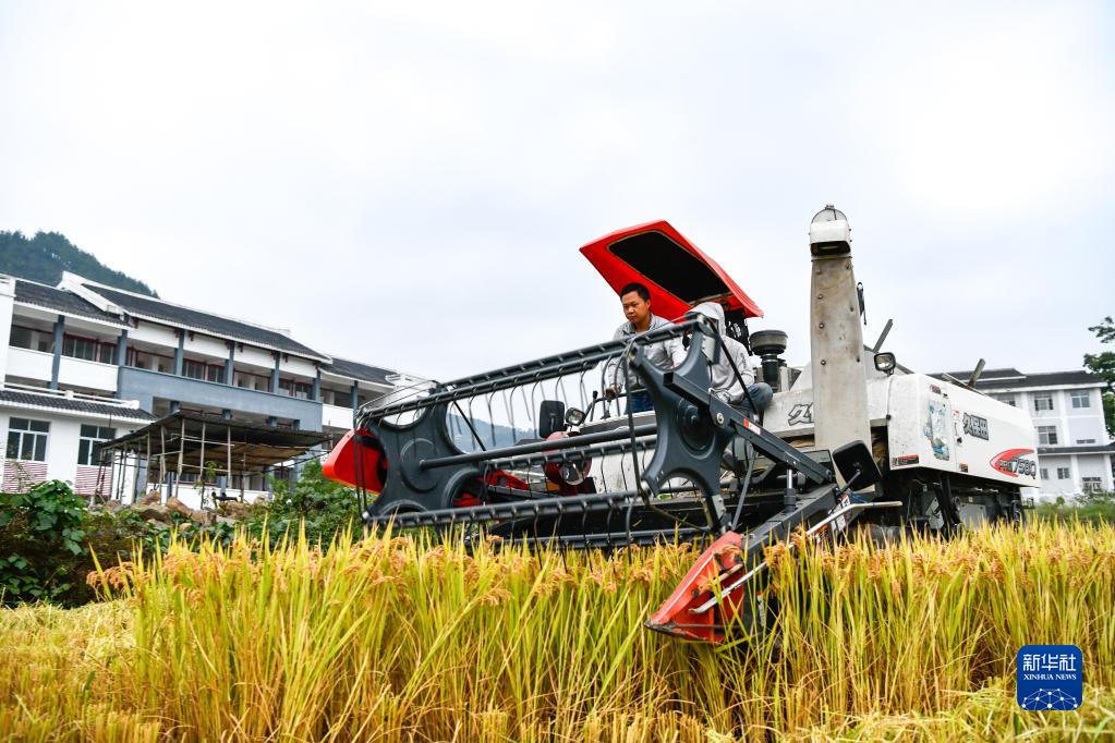 10月8日,在贵州省麻江县坝芒乡乐坪村,赵祥榕与工人协作驾驶收割机收割水稻。