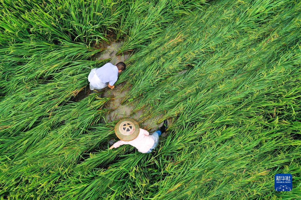在贵州省麻江县坝芒乡乐坪村,赵祥榕和妻子在整理因大风天气倒伏的水稻(8月24日摄,无人机照片)。新华社记者 杨文斌 摄