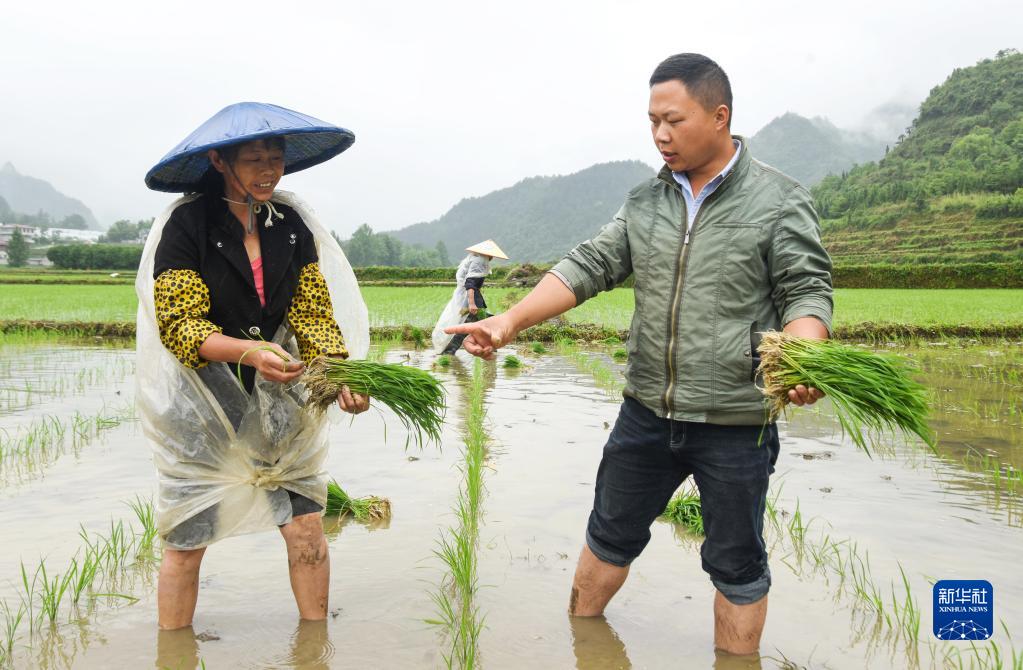 在贵州省麻江县坝芒乡乐坪村,赵祥榕(右)向村民讲解插秧间距相关注意事项(5月28日摄)。新华社发(罗文刚 摄)