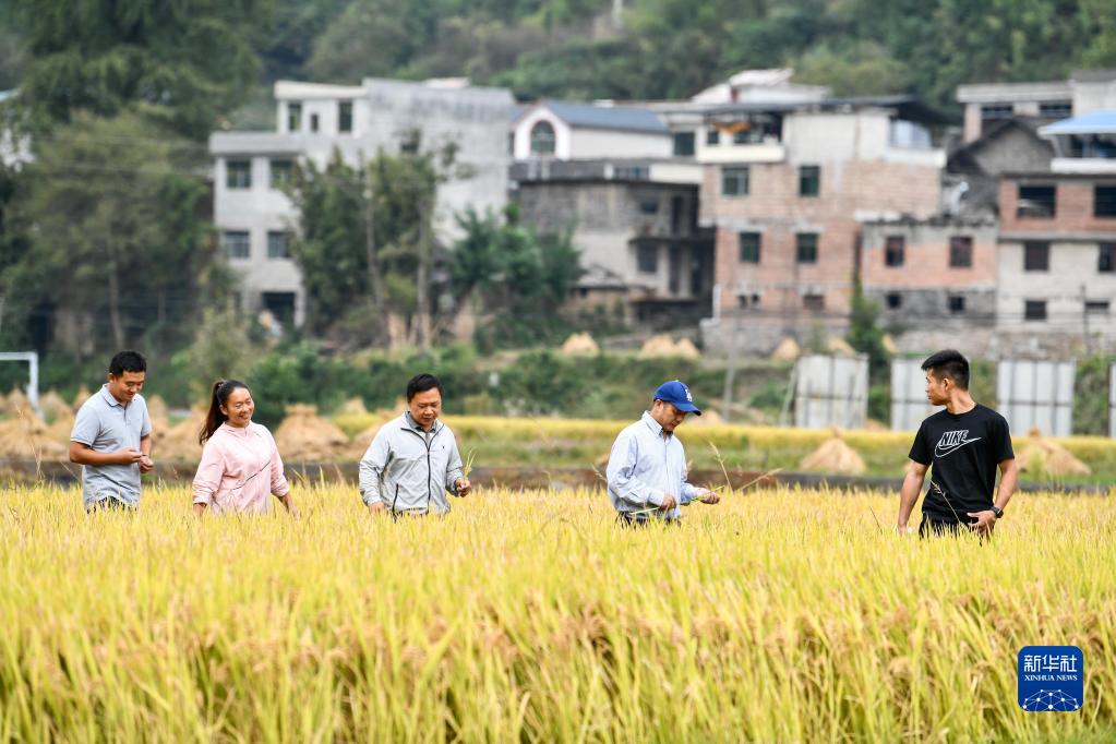 10月8日,在贵州省麻江县坝芒乡乐坪村,赵祥榕夫妇(左三、左二)与农业专家及随行学生走在金黄的稻田里。新华社记者 杨文斌 摄