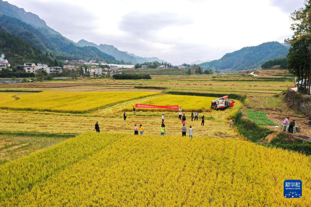 10月8日,在贵州省麻江县坝芒乡乐坪村,人们参加从南京农业大学引进试种的水稻新品种测产验收现场会(无人机照片)。新华社记者 杨文斌 摄