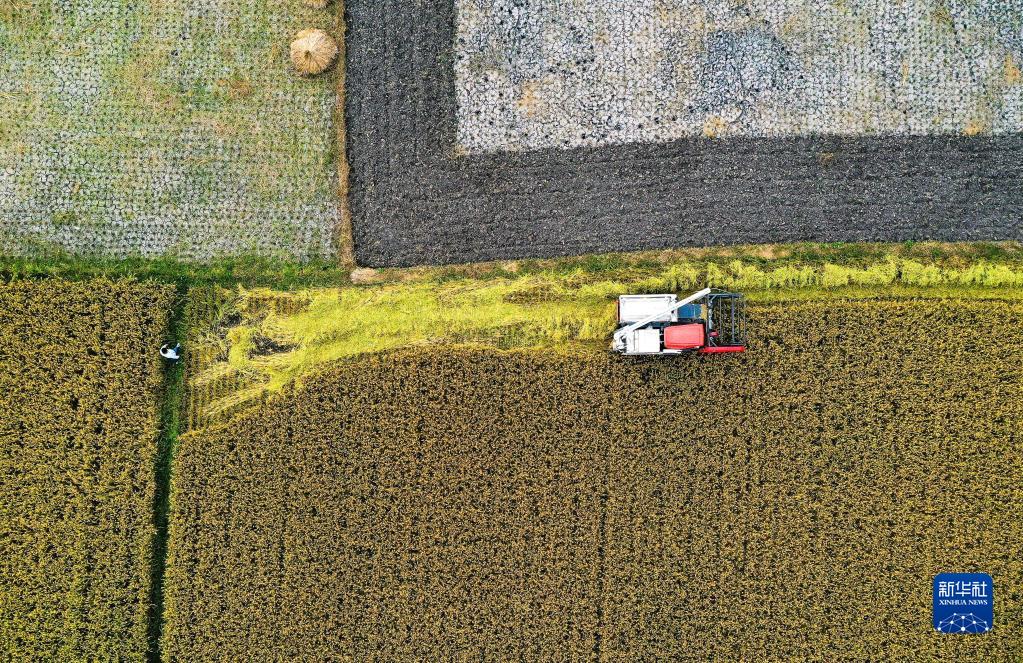 10月8日,在贵州省麻江县坝芒乡乐坪村,赵祥榕在查看水稻收割进展(无人机照片)。新华社记者 杨文斌 摄