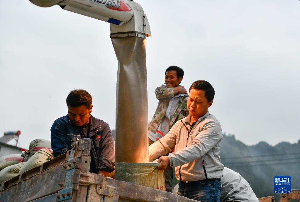 10月8日,在贵州省麻江县坝芒乡乐坪村,赵祥榕(前右)与工人装载收割的稻谷。新华社记者 杨文斌 摄
