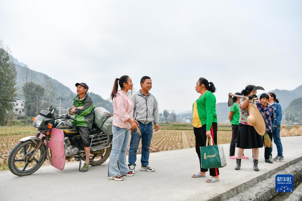 10月8日,在贵州省麻江县坝芒乡乐坪村,赵祥榕夫妇(左三、左二)在秋收现场与乡亲们交流种稻心得。新华社记者 杨文斌 摄