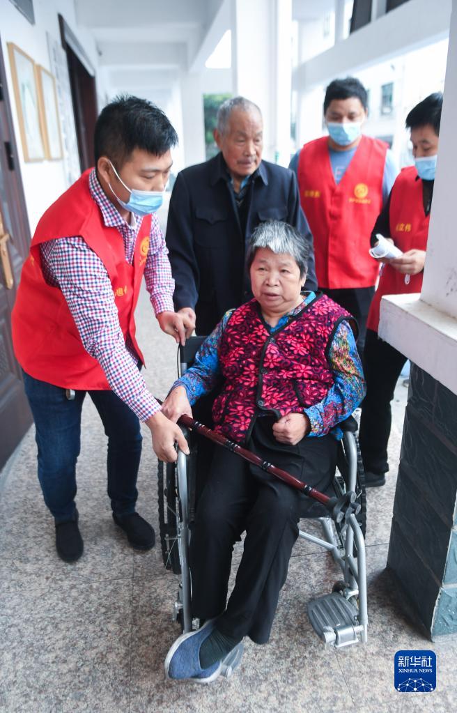 10月12日,苏溪镇六都村的党员志愿者们陪着参加孝心宴的老人进入居家养老服务中心。