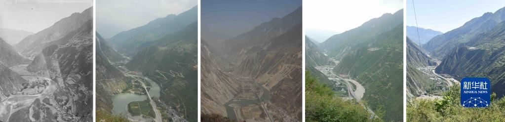 拼版照片:1908年5月27日威尔逊拍摄的岷江河谷(左一,印开蒲供图)和2007年8月26日、2009年3月14日、2014年6月22日、2019年6月5日由印开蒲拍摄的岷江河谷照片(左二至左五)。新华社发
