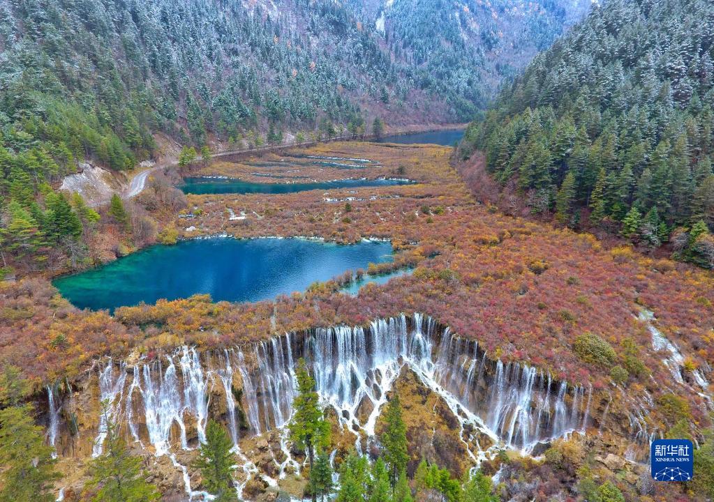 四川九寨沟景区诺日朗瀑布及诺日朗群海(2018年11月6日摄,无人机照片)。新华社记者 刘坤 摄