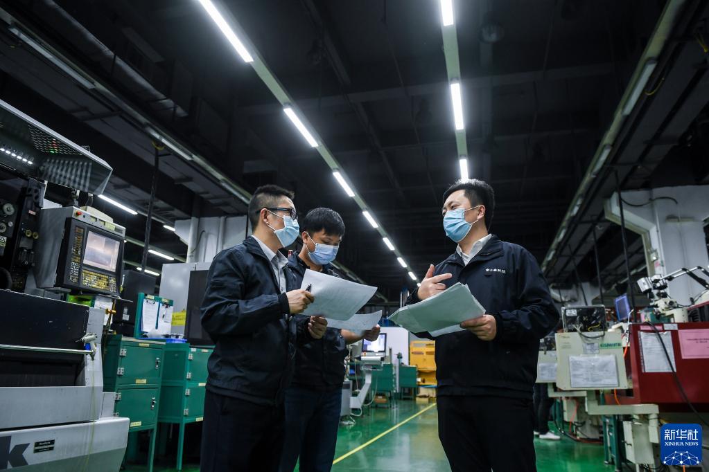 在深圳富士康科技集团龙华科技园,全国人大代表杨飞飞(右)与产业工人交流(2021年2月25日摄)。