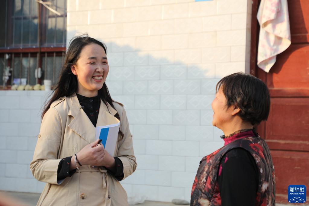 在甘肃省陇南市徽县水阳镇石滩村,全国人大代表梁倩娟(左)同村民石海萍交流(2021年2月23日摄)。