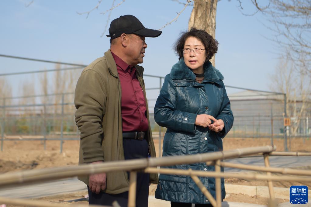 在位于内蒙古乌兰察布市的冷凉蔬菜院士工作站试验田里,全国人大代表郭艳玲(右)与工作人员交流(2021年2月24日摄)。
