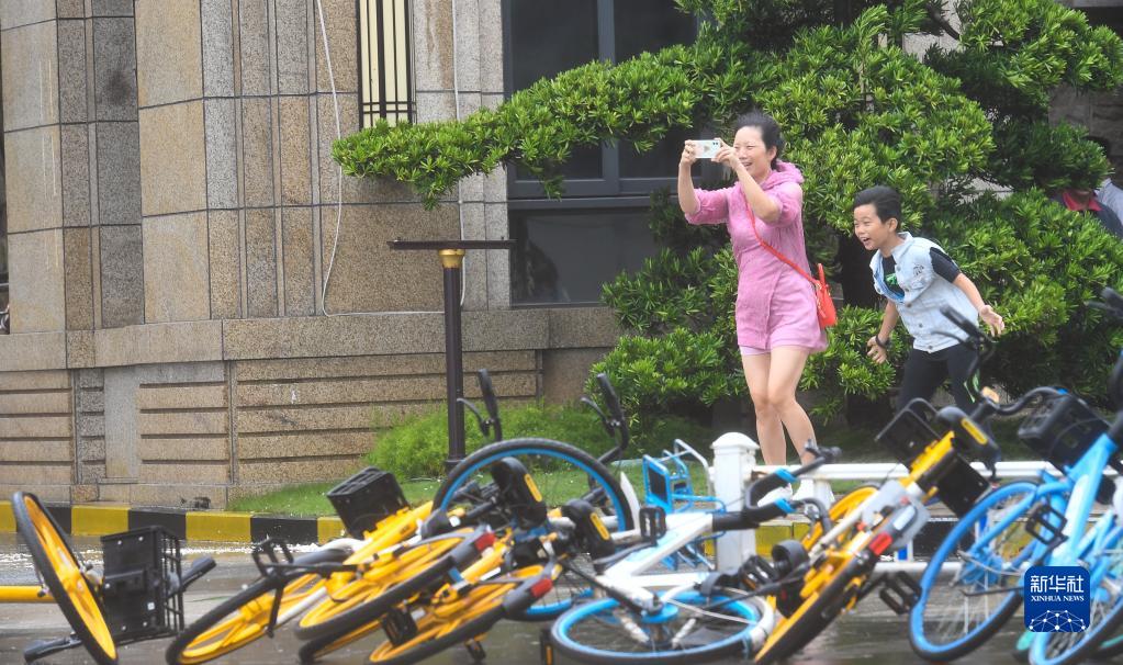 10月13日,在海口市美丽沙路附近的海边,市民在用手机拍摄巨浪。