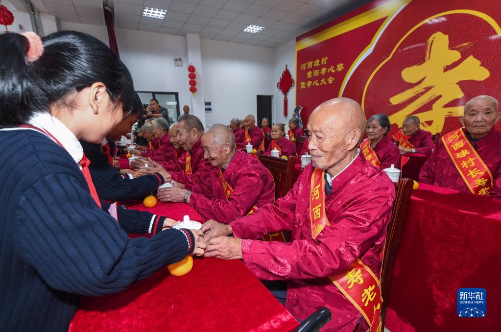 重阳节将至,浙江省杭州市临平区塘栖镇河西埭村为全村的老人们举办重阳“孝心大会”,200多名70岁以上老人在活动现场看皮影戏、吃重阳糕、尝孝心宴。