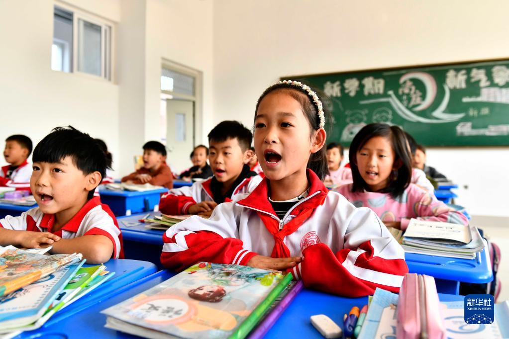 10月12日,在菏泽市东明县尚庄社区尚庄小学,学生们在背诵古诗。