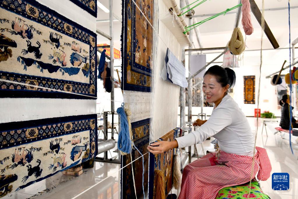 10月13日,村民在菏泽市鄄城县六合社区乡村振兴创业车间加工地毯。