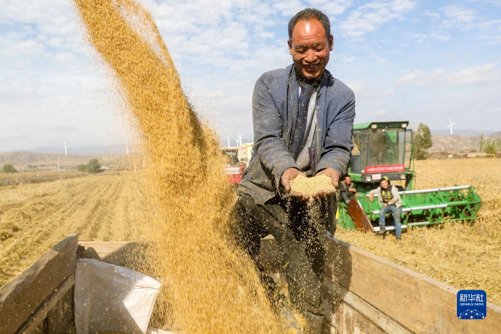 10月13日,山西省繁峙县郝家湾村的村民在展示抢收的谷子。