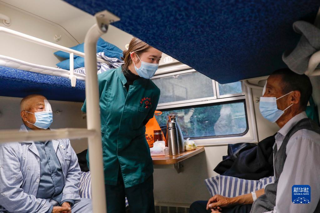 10月12日,当地基地医院护士在车上病房向术后患者进行宣教。新华社记者 张玉薇 摄