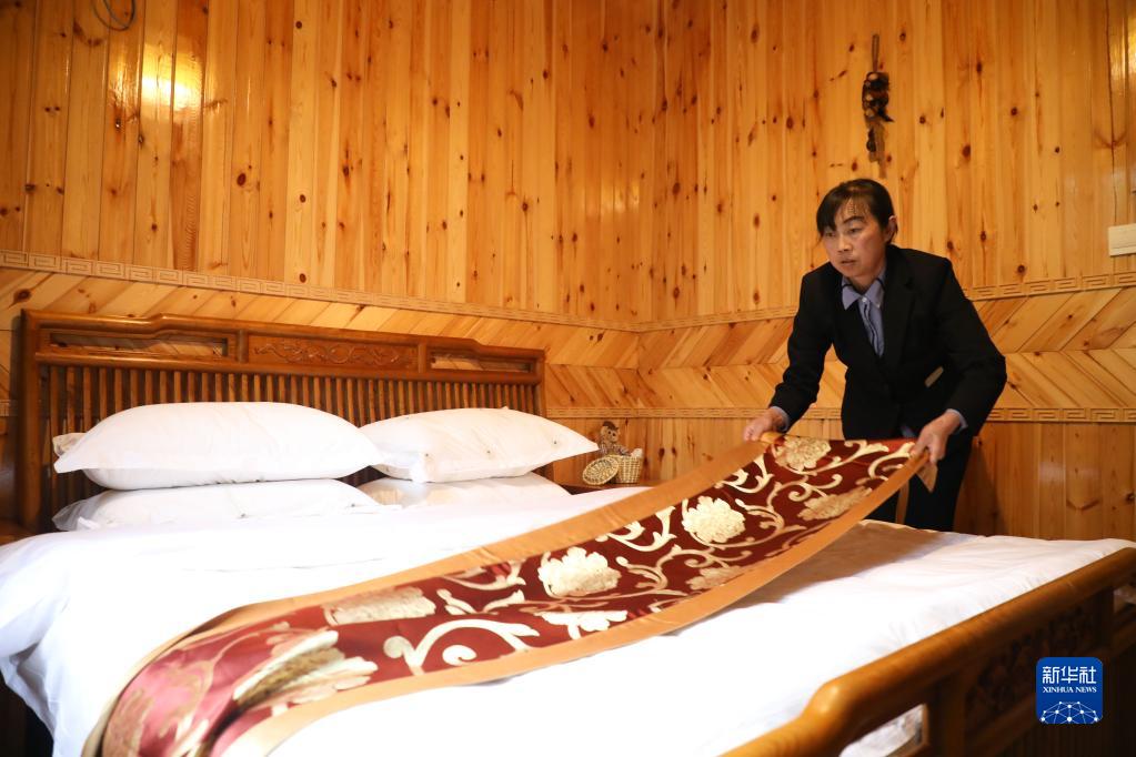10月13日,服务员在舟曲县巴藏镇前北山村各皂坝生态园的民宿里整理床铺。