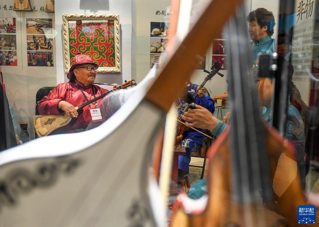 10月14日,在新疆美术馆展馆内,来自新疆博尔塔拉蒙古自治州的非遗传承人在现场演奏民族乐器。