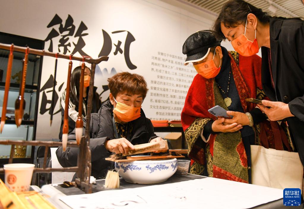 10月14日,在新疆美术馆展馆内,来自安徽省的非遗传承人吴琼(左)在现场演示毛笔制作。