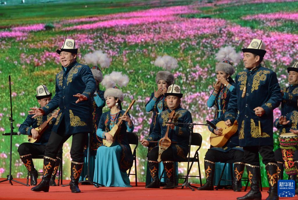 10月14日,演员在开幕式上演唱柯尔克孜史诗《玛纳斯》选段。